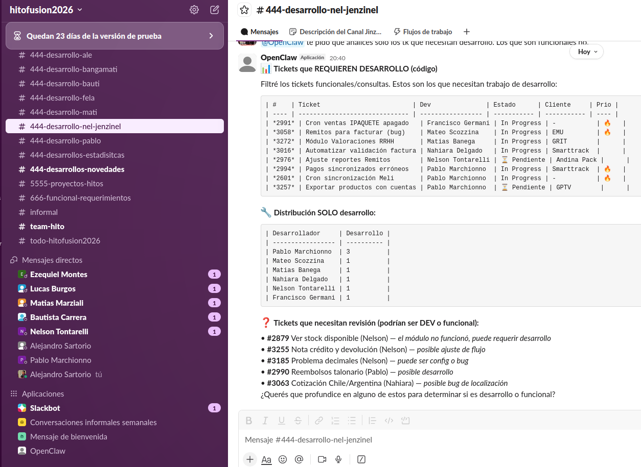 Podes consultar al Agente de IA JinzoNel que tiene todas las respuestas sobre el estado y situación de cualquier tarea de desarrollo de HitoFusion